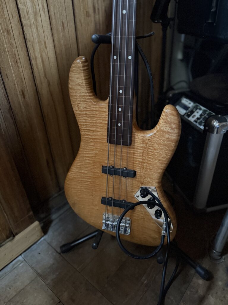 バルトリーニのピックアップとターボベースのポッド、フラットワウンドの弦を付けたベースは、古いアンペッグB-50の真空管アンプと相まって、いつまでも弾いていたいほどゴキゲンです。